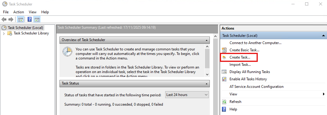 Once Task Scheduler opens, in the right column window click on Create Task: