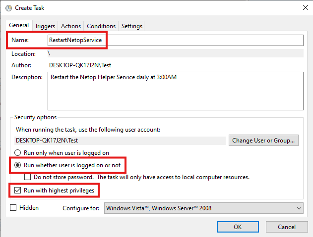 Leave the rest of the settings default and slect OK again to create the task. You will be prompted to enter user credentials with administrative rights if "Run with highest privileges" was selected.