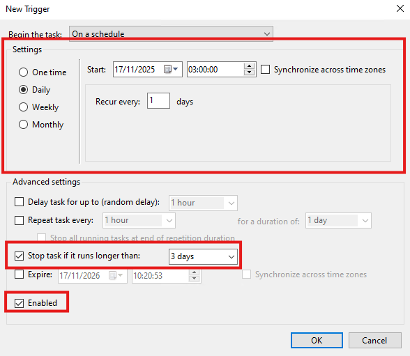 Select the Start: day and time the task will start triggering. If set for Daily, Weekly or Monthly the time configured will be used for the recurring triggers.