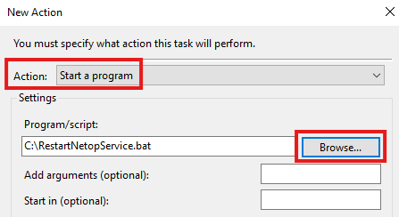 Program/script: click the Browse button and navigate to your saved .bat file.